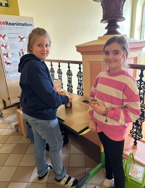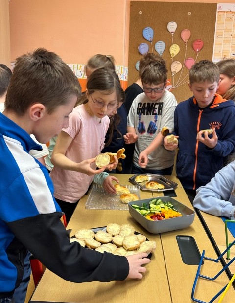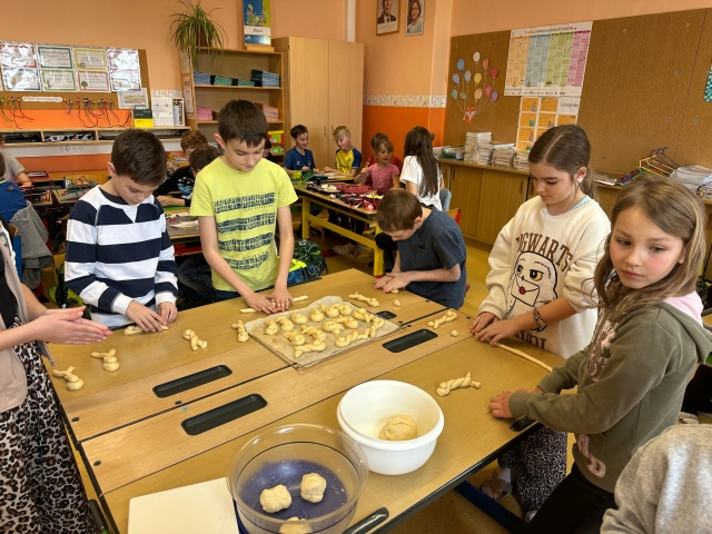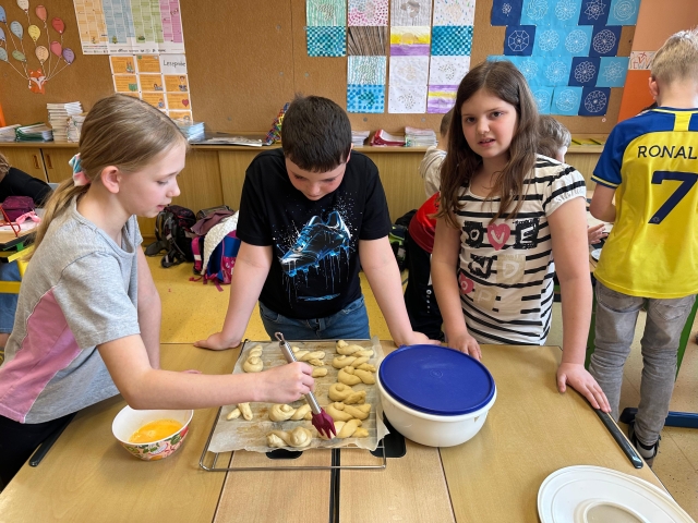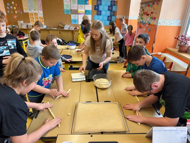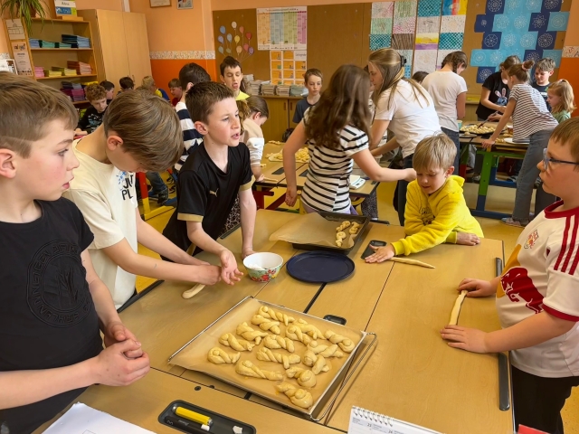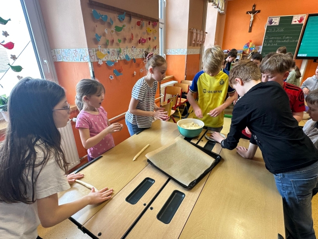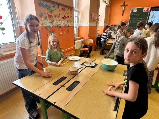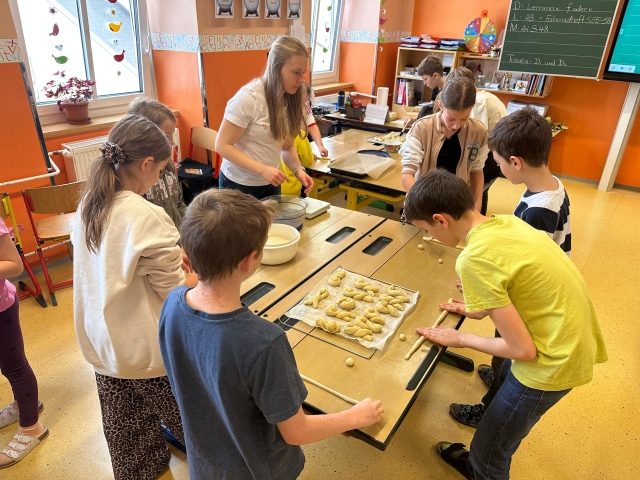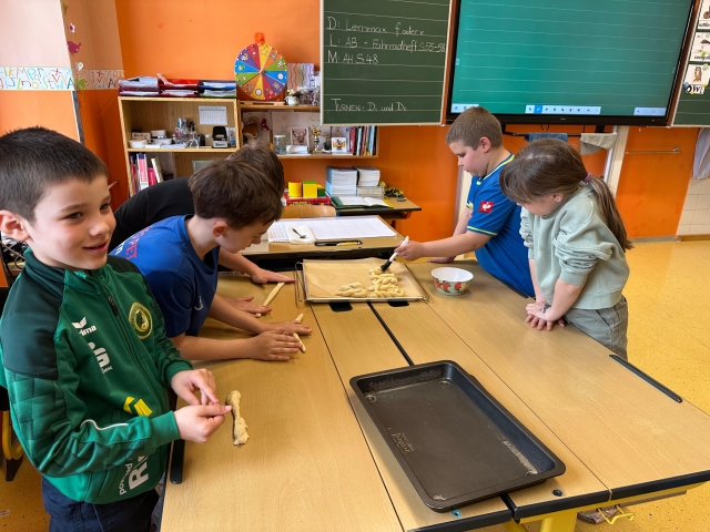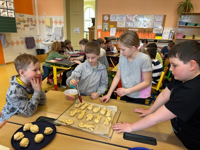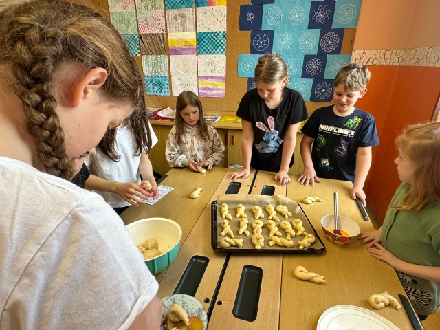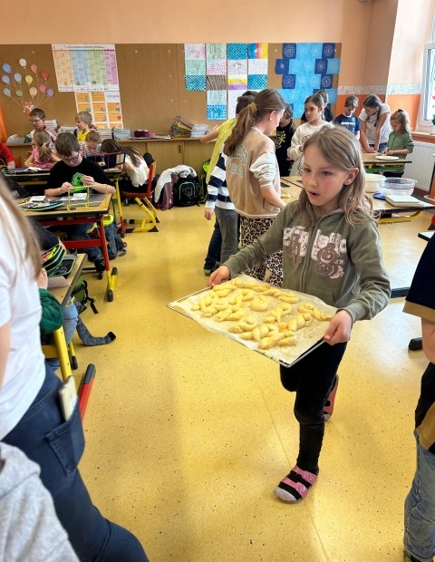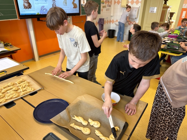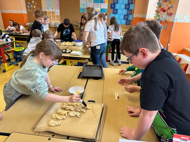 Die SchĂŒlerinnen und SchĂŒler der 1. und 4. Klasse backten als kleine Einstimmung auf die Osterzeit gemeinsam leckere Hasen aus Germteig. Mit viel Sorgfalt wurde der Teig genau abgewogen, anschlieĂend gerollt und liebevoll in Hasenform gebracht. Danach bestrichen die Kinder ihre Kunstwerke mit Ei, bevor sie im Ofen goldbraun gebacken wurden.